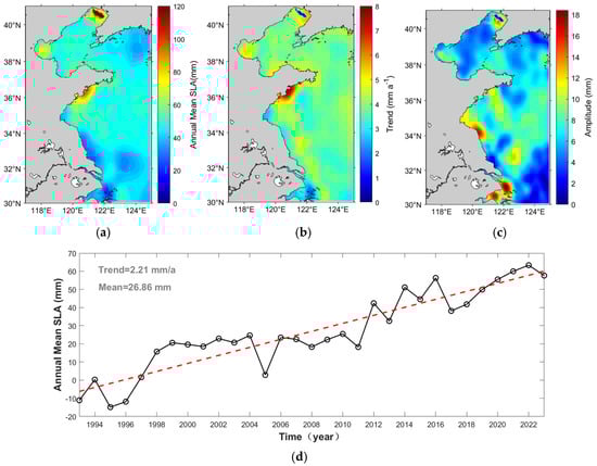 Spatiotemporal distribution and trend analysis of satellite altimetry sea-level anomaly (SLA) from January 1993 to December 2023. (a) Multi-year average SLA spatial distribution. (b) Rate of change of multi-year average SLA spatial distribution. (c) Interannual SLA amplitude spatial distribution over a ten-year period. (d) Annual mean SLA time series with linear trend.