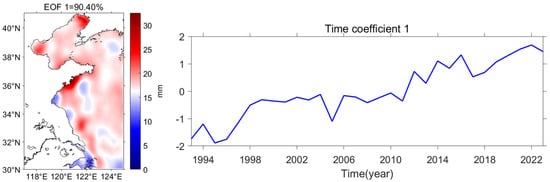 We employed the EOF analysis method to decompose the annual sea-level variations in the YS and BS region, extracting the first three modes. The first mode accounted for 90.40% of the total variance, followed by the second (2.78%) and third (1.47%) modes (Figure 3). The first mode exhibits a basin-wide coherent variation pattern, reflecting the dominant influence of large-scale atmospheric forcing and seasonal thermal expansion on sea level. In the following sections, this primary mode will be further examined in relation to sea surface temperature (SST) and precipitation to explore its potential driving mechanisms.