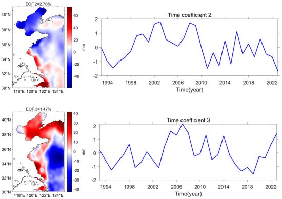 The first EOF mode, which explains the majority of the variance, reflects large-scale sea-level changes driven by regional atmospheric and oceanic processes, particularly the East Asian monsoon and oceanic circulation patterns. The second mode highlights smaller, more localized variations, possibly related to seasonal changes, freshwater inputs from rivers, and regional climate fluctuations. The third mode, though contributing less to total variance, captures extreme climate events, human activities, and other anomalies. Despite its small contribution, the time coefficient amplitude is large, indicating strong short-term effects on sea-level variability during certain periods. These results suggest that sea-level anomalies are influenced by both natural factors (thermal expansion, ocean circulation) and anthropogenic factors (land reclamation, hydrological changes).