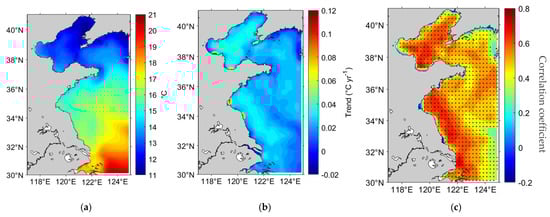 Spatial patterns of annual mean SST, its trend, and its relationship with the first EOF mode in the Yellow and Bohai Sea region. (a) Spatial distribution of the annual mean Sea Surface Temperature (SST). (b) Spatial distribution of the annual mean SST trend. (c) Spatial distribution of the correlation coefficients between the first mode of EOF analysis and SST.