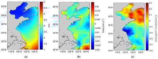 The spatial distribution of the multi-year average sea-level anomalies (SLA) for the YS and BS regions was calculated, revealing the long-term variations in sea-level trends (Figure 2). The analysis indicated that the sea-level anomalies in these regions exhibit both spatial and temporal variability, influenced by atmospheric pressure patterns, ocean currents, and regional climate fluctuations [22]. The northeastern marginal seas of the BS showed higher sea levels, while areas near Lianyungang in the YS also exhibited elevated sea levels. However, the rate of sea-level rise was higher near Lianyungang. Overall, the sea level in the YS and BS is rising, with regional variations in the rate of increase.