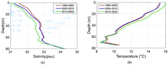 Profiles of temperature and salinity in the Bohai and Yellow Seas from 1993 to 2020 as a function of depth. (a) Salinity profiles with depth on a decadal scale. (b) Temperature profiles with depth on a decadal scale.