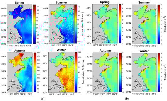 During the spring and summer months, higher sea-level anomalies are observed, particularly along the coastal regions, which can be attributed to thermal expansion and increased precipitation during warmer months, as reported by previous studies [36]. The summer monsoon, which brings more rainfall and freshwater influx into the BS, tends to elevate local sea levels through freshwater input and changes in ocean currents. Conversely, during the autumn and winter months, the SLA decreases, which is likely related to the cooling of the water, atmospheric pressure systems, and the dominance of stronger cold air outbreaks that reduce regional sea-level height [37]. Furthermore, the rate of change in the SLA over these seasons (Figure 7b) shows significant variability. The spring and summer months exhibit a higher rate of change, indicating more pronounced seasonal fluctuations in sea-level anomaly. In contrast, autumn and winter exhibit more moderate changes in sea level, reflecting the relative stability of the oceanic system during colder months.