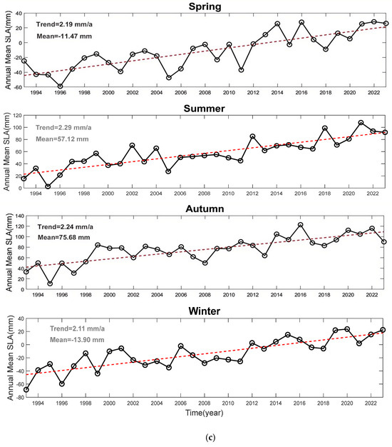 The time series of SLA for each season (Figure 7c) indicates that the seasonal trends are largely consistent over the study period, with notable fluctuations in sea level during the summer months. The linear trend estimation suggests that, overall, the seasonal sea-level anomalies have slightly increased over the past three decades, with higher anomalies observed in summer compared to winter, indicating an intensification of seasonal variation in the region.
