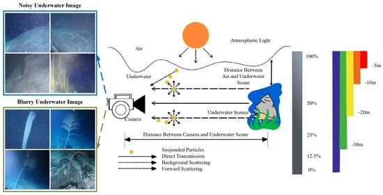 The underwater imaging environment is influenced by factors such as marine organisms, suspended particles, and poor lighting conditions, which makes it more complex than imaging on land. Underwater images often exhibit a low contrast, color distortion, and blurred details []. The movement of underwater robots can further exacerbate these issues, particularly due to particles, including marine organisms, floating feces, suspended sediments, and other inorganic matter. These particles vary in size, shape, and transparency. Scattering occurs when underwater light encounters small particles and is reflected back to the camera, resulting in a low contrast and blurriness in the captured images, as shown in Figure 1. Underwater optical images exhibit color distortion and are influenced by many impurities and motion blur. Consequently, these images cannot be directly used for target detection and require additional restoration.