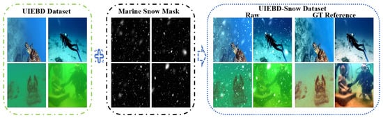Experimental comparative analysis was conducted on two datasets, UIEBD-Snow and UIEBD-Blur, to verify the effectiveness and generalizability of the proposed method, which a focus on the impurities and motion blur in the underwater image restoration process. Both datasets are based on the commonly used public dataset UIEBD []. Figure 6 presents a schematic diagram of the UIEBD-Snow dataset construction.
