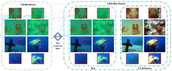 Existing methods for restoring underwater optical images typically focus on color correction and enhancement rather than addressing impurity occlusion and blurriness in real underwater images. Moreover, the lack of publicly available datasets further complicates the restoration process []. To address these challenges, Mei et al. [] proposed the Underwater Image Enhancement Benchmark Dataset (UIEBD-Snow dataset) to explore underwater optical image restoration involving impurities. However, datasets for restoring underwater images affected by motion blur are lacking.