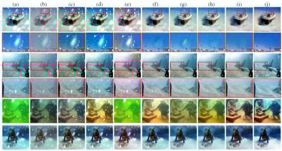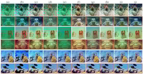 Comparison of TFCNet and the contrastive methods using the UIEBD-Blur dataset: (a) raw; (b) Deepwave []; (c) PUIENet []; (d) Shallow []; (e) FUnIE-GAN []; (f) DGUNet []; (g) MPRNet []; (h) UIRNet []; (i) TFCNet; (j) GT.