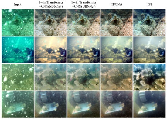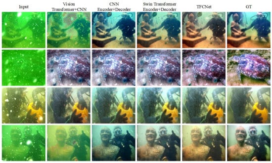 A visual study was performed on the UIEBD-Snow dataset for a qualitative analysis. Figure 10 reveals that the model combining a Vision Transformer-based encoder with a CNN-based encoder did not effectively learn the mapping relationships, where it exhibited shallow learning capabilities during training and testing and performed poorly on challenging samples. The pure CNN-based encoder–decoder structure struggled to model the mapping between color and target images, which left considerable room for improvement in detail restoration. Combining the original Swin Transformer-based encoder with the CNN-based decoder improved the enhancement and restoration of underwater optical images to some extent; however, its overall performance remained measurably inferior to TFCNet.