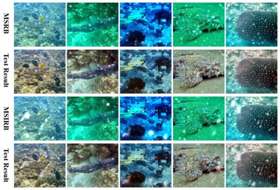 These methods are highly competitive in natural image restoration in the air; however, land-based and underwater imaging models cannot be used interchangeably. Sato et al. [] proposed an underwater image restoration dataset multi-scale residual block (MSRB), which only performs underwater image denoising and cannot perform color correction. Mei et al. [] proposed a lightweight baseline named UIR-Net, which simultaneously recovers and enhances underwater images while achieving notable recovery results. However, it still encounters limitations in color correction.