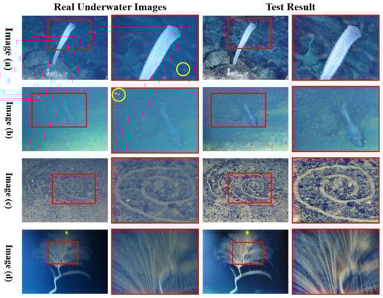 Initially, we focused on assessing a subset of images from the MSRB dataset [], which is used for marine snow noise elimination in underwater optical imagery, along with its extended version, the MSIRB dataset []. Figure 12 illustrates the evaluation results, which involve real underwater optical images affected by marine snow noise.