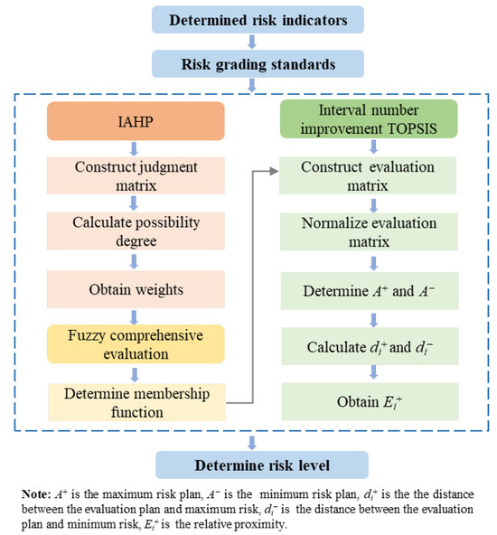 The risk assessment process is mainly divided into three stages, each stage applying a different method. Firstly, the weight of the risk factors is determined using IAHP based on expert opinions and relevant information. Secondly, the weight values of the evaluation indices combined with the triangular fuzzy number membership function were used to obtain the result vector. Finally, the TOPSIS method is used to calculate the
