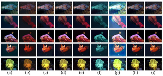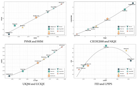 To assess the quality of underwater images comprehensively, we used the Underwater Image Quality Metric (UIQM) to evaluate the sharpness, color, and contrast. The larger the value of the UIQM, the better the quality of the image. We also used the Underwater Color Image Quality Evaluation Index (UCIQE) to quantify the balance of color distribution, contrast, and saturation. In addition, the Natural Image Quality Evaluator (NIQE), a non-referenced index based on natural scene statistics, has a lower value, indicating that the image is closer to the natural distribution, thus reflecting better image quality.