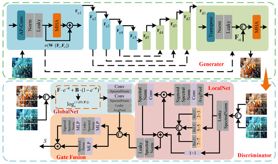 The development of deep learning (DL) in image vision has brought a new research avenue for underwater image enhancement tasks. A large number of underwater enhancement network models have achieved satisfactory performance. Xue et al. [18] proposed the S2D2 framework, which introduced a learnable color space and semantic-aggregated fusion strategy to decouple and eliminate underwater degradations, boosting performance in downstream semantic vision tasks. LiteEnhanceNet [19], a lightweight underwater image enhancement network, utilized depthwise separable convolutions and efficient feature aggregation to reduce computational complexity. The application of the transformer on the vision domain further enhanced the performance of the network [20,21]. Yang et al. [22] proposed a progressive aggregator with a feature-prompted transformer, effectively improving image texture and detail by integrating global and local attention mechanisms. Shang et al. [23] proposed the LGT framework, which leveraged a biologically inspired luminance-balancing curve and self-attention mechanism to adaptively fuse multi-scale features, improving image quality across diverse underwater scenes. Generative adversarial networks (GANs) further improve the color balance, human eye perception, and observability of the enhanced images. The emergence of diffusion models makes GANs further improve their performance [24,25]. In addition, the application of large models, reinforcement learning, and unsupervised techniques in the field of underwater image enhancement likewise improves the visual quality of the enhanced images [26,27,28]. However, the above methods are designed for general underwater image enhancement tasks, which confront significant limitations in low-light conditions. Under extremely low light, the image texture details and global colors are suppressed, rendering it challenging for general enhancement networks to model color mapping. Compared to other GenAIs [29,30,31], GANs generate clearer and more realistic images and can generate images quickly. In addition, GANs do not require multi-step sampling during generation and perform better in generating data in continuous space. Through conditional control, GANs can also flexibly realize tasks such as style migration and image generation, giving them a unique advantage in high-quality image generation and visual content [32]. However, GANs often suffer from unstable training and may produce unrealistic colors or hallucinated details in the absence of sufficient illumination cues. Additionally, the reliance on high-quality training data and substantial computational overhead restrict their applicability in complex and variable low-light underwater environments.