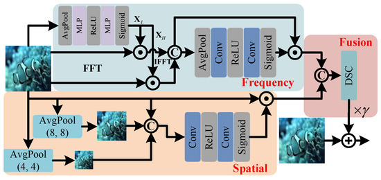 Traditional frequency domain enhancement methods separate color bias components using the Fourier transform but lack the capacity to model the non-uniform distribution of scattering noise in the spatial domain, which leads to artifacts in the enhanced images. As illustrated in Figure 3, we propose a Multi-scale Hybrid Attention (MHA) module to enhance the network’s noise robustness through a cross-domain collaboration mechanism to compensate for local information ambiguity due to low light and scattering by capturing global semantics and remote dependencies in underwater images.
