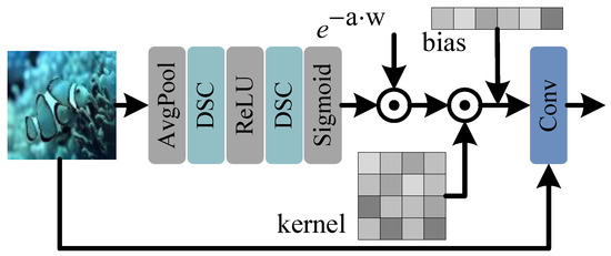 Turbulent disturbances in low-light environments often lead to non-rigid deformation of the water body, causing traditional convolution operators to suffer from feature misalignment due to accumulated errors in offset field prediction. To address this challenge, we propose an Adaptive Parameterized Convolution (AP-Conv), as shown in Figure 4, which enhances the network’s robustness and adaptability by dynamically adjusting convolution kernels and aggregating features across branches. Unlike general dynamic convolutions that focus on kernel modulation or offset learning [33,34], AP-Conv incorporates a dual-branch design that explicitly balances semantic awareness and structural preservation, making it more suitable for the complex distortions in underwater environments.