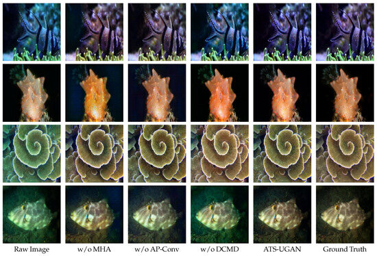 The above experiments demonstrate that ATS-UGAN effectively addresses the challenges of underwater low-light image enhancement. This performance is primarily attributed to the algorithm’s integration of MHA, which enables synergistic extraction of information in both the frequency and spatial domains. This integration enhances contextual feature understanding and reinforces global consistency, particularly improving the preservation of fine textures and structural integrity. Additionally, the use of AP-Conv with dynamic convolutional kernels allows the network to better manage spatially varying degradations, such as uneven illumination and localized color biases. Furthermore, DCMD adaptively adjusts the network’s update strategy by leveraging spatial and frequency domain information. This facilitates more effective integration of structural and chromatic features, resulting in improved visual smoothness and more natural color reproduction.