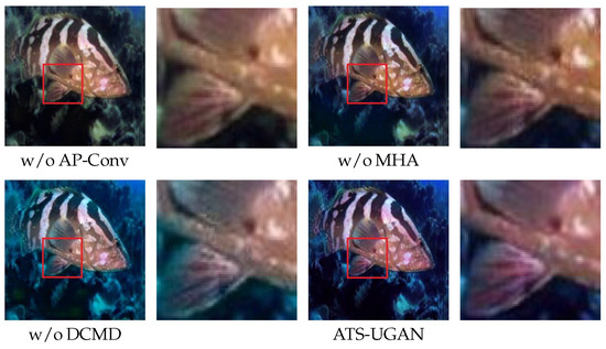 To validate the effectiveness of the Multi-scale Hybrid Attention (MHA) module, we conducted an ablation study by removing MHA while keeping the rest of the network architecture unchanged. As shown in Table 3, removing MHA leads to a noticeable performance degradation on the EUVP dataset. Specifically, PSNR drops to 25.6, and SSIM decreases to 0.80, indicating reduced fidelity and structural consistency. Additionally, CIEDE2000 increases significantly to 7.4, suggesting severe color distortion. UIQM and UCIQE drop to 3.44 and 0.72, while LPIPS and FID increase to 0.30 and 30.21, respectively, reflecting poor perceptual quality and low contrast. The visual comparison in Figure 7 and Figure 8 further supports these quantitative results. Without the MHA, the enhanced images appear darker and exhibit unnatural color tones, especially in the background and marine organisms. Noticeable texture blur and a persistent blue-green color cast remain, highlighting the importance of the module in improving structure and color restoration.