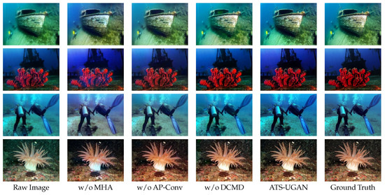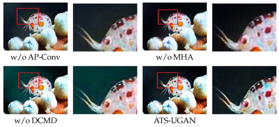 The DCMD integrates local shallow texture features and global deep semantic information, enhancing the network’s capacity for information mapping and image reconstruction. As shown in Table 3, removing DCMD results in a marked decline in performance. The SSIM drops to 0.70, the lowest among all variants, while the PSNR falls to 25.2. Although the CIEDE2000 remains at a moderate level, the perceptual quality metrics decline sharply, with UIQM decreasing to 3.20 and UCIQE to 0.69, and the LPIPS and FID increasing to 0.28 and 26.95, respectively, indicating a significant reduction in overall visual quality and clarity. Visual results in Figure 7 and Figure 8 further corroborate this, showing blurred image details, considerable loss of structural texture, and pronounced color tone deviations following the removal of DCMD.