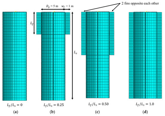 Figure 1 ( 3 cases as a representative) shows the geometry of the ratio of finned suction anchors of different fin lengths, , to shaft length, : = 0, 0.25, 0.50, and 1.0. The length-to-diameter ratio, , of the suction anchors varies from 1.5 to 3 and 5. The diameter, , is maintained at 5 m for all analyses since does not affect the normalized bearing capacities [31]. Four fins are considered and the width of the fins is constant at 0.2 (1 m) in all analyses. The fin width is adopted by Garcia and Panayides [1]. The top lid, skirt, and fin thickness, t, is fixed at 50 mm. The finned suction anchors are modeled as a rigid body.
