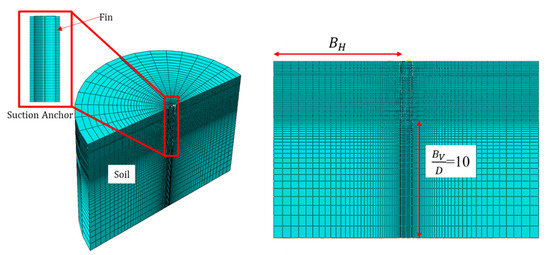 The finite element method is carried out using the commercial package Abaqus 2017. Considering the symmetry of the problem, only one-half of the finned suction anchors are modeled to save computational effort. The fin is modeled for half its thickness at the symmetry plane. The soil is modeled with an eight-node linear brick with a hybrid, constant pressure, reduced integration, and hourglass control formulation (element type: C3D8HR). The hybrid element is appropriate for simulating the incompressibility of clay, whose volume does not change under undrained conditions [37]. A thin soil (thickness, = 50 mm) layer located adjacent to the surface of the finned suction anchor is modeled to represent the reduced strength of the soil due to thixotropy and consolidation [6]. The reduced strength ratio, α, of the soil is 0.65. The lateral boundaries of the soil model are constrained against both vertical and horizontal movements. The base is fully fixed (restrained in all directions), while the top surface is free of any constraints. A typical mesh and geometry of the soil model are shown in Figure 3. The soil comprises a finer mesh zone adjacent to the finned suction anchor and a coarser mesh near the soil boundary to reduce the simulation time without compromising the accuracy of the result. and represent the vertical and horizontal boundary extents from the skirt tip and the shaft of the suction foundation, respectively. The boundary with and is known to have a minimal effect on the bearing capacities [31]. Table 2 shows the soil dimension and number of elements adopted in the study for different and ratios. The diameter of the soil model is constant at 150 m while the soil depth varies from 57.5 to 75 m depending on the ratio. The corresponding = 10 for ratios of 1.5, 3, and 5 is constant. The finned suction anchors are modeled as discrete rigid bodies. A displacement-controlled method is adopted, and the load is applied at a reference point (RP) located at the top center of the lid. Numerical simulations are carried out in monotonic loadings under the conditions of free water by using effective stresses [38].