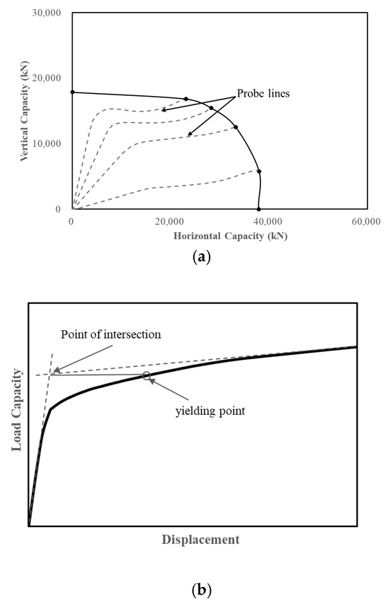 A series of displacement probe analyses are conducted to determine the bearing capacity envelope under V–H (Vertical–Horizontal) loadings. The VH failure envelope is constructed by plotting the vertical (V) and horizontal (H) load components from the corresponding load–displacement curves extracted at the reference point (RP). In the probe method, the vertical and horizontal displacements increased simultaneously at a constant dH/dV ratio. One loading path tracks around the capacity envelope and reaches one failure point on the capacity envelope [35] as shown in Figure 4a. By varying the dH/dV displacement ratio, failure points along the capacity envelope are obtained. The displacement probes dH/dV = 0, 0.25, 0.50, 1, and 4, and ∞ (pure horizontal displacement) are used in tracking the capacity envelope in all models. Pure vertical and horizontal probes are represented by ∞ and 0, respectively. In the probes (dH/dV = 0.25, 0.50, 1, and 4), the displacement is increased until it reaches a displacement of 10% (0.5 m) of the finned suction bucket, similar to the criterion with Kim et al. [41]. However, in cases wherein the displacement probes (dH/dV = 0.25, 0.50, 1, and 4) did not reach the specified criteria due to numerical convergence problems during simulation, the corresponding displacement probe is not plotted in the VH failure envelope.