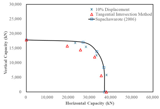 On the other hand, the pure capacity load–displacement curve under ∞ and 0 may not reach its ultimate state (i.e., continued deformation at constant load). In addition, the load–displacement curve may follow a positive gradient in the load–displacement curve, particularly for higher ratios [6] and finned suction anchors due to the continuous mobilization of the soil. In all cases, the ultimate vertical bearing capacity and ultimate horizontal bearing capacity are determined using the tangent intersection method as shown in Figure 4b [42,43]. The method plots two tangential lines along the initial stiff elastic region and plastic region of the load–displacement curve, and the load corresponding to the intersection point of the two lines is taken as the yielding point (bearing capacity). This method is also used by Hung et al. [37] and Kim et al. [44].