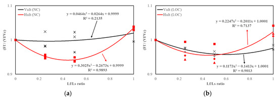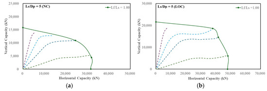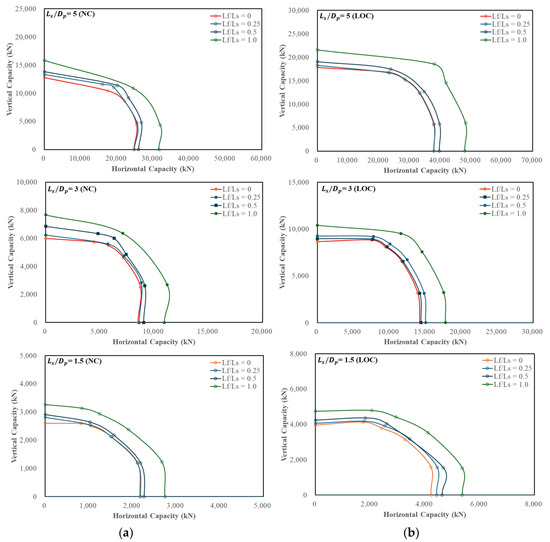 VH failure envelopes for various and ratios in (a) NC and (b) LOC.