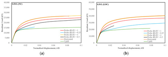 The VH failure envelopes for NC and LOC soils for different and ratios are shown in Figure 6. As previously mentioned, if the displacement probes (inclined load paths) do not reach the specified failure criterion (i.e., 10% displacement), those probes are excluded from the VH failure envelope. Figure 7 presents representative loading paths (dashed lines) from the numerical simulation for 1.0 VH failure envelope under NC and LOC conditions, corresponding to = 5. An example of a load–displacement curve, expressed in terms of normalized displacement d/D and resultant load R, is shown in Figure 8 for 1.0 (also with 5). The resultant load R has a relationship with the vertical and horizontal components by the equation: , wherein V and H are the corresponding vertical and horizontal loads extracted at the reference point (RP). The corresponding V and H values from the resultant load at 10% diameter (or 0.5 m resultant displacement) are selected as inclined failure points.