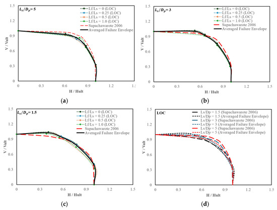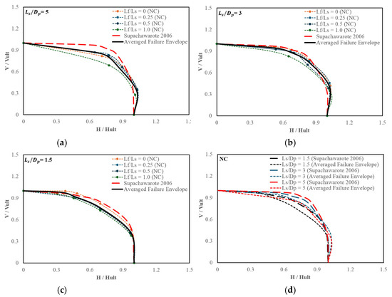 Normalized VH failure envelopes for various ratios in LOC against Supachawarote [6]: (a) = 5; (b) = 3; (c) = 1.5; and (d) averaged failure envelopes.
