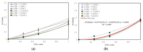 Figure 11a,b illustrates , defined as the ratio of the load capacity of the finned suction anchors to the conventional suction anchors, as a function of ratio for various ratios. In Figure 11a, a clear increasing trend is observed, with the magnitude of rising as the ratio increases. However, this increase does not follow a consistent linear or exponential pattern, which can be attributed to the influence of the soil profile, as different soil conditions significantly affect the load-transfer mechanisms and, consequently, the fin-induced capacity enhancement. Conversely, Figure 11b reveals a more distinct trend in horizontal capacity, with showing a stronger correlation to fin geometry. To better capture this relationship, a best-fit curve with R2 = 0.985 has been introduced, approximating values for horizontal capacity across different ratios. The equation follows the general equation where the coefficients a, b, and c are 0.2971, −0.0287, and 1.006, respectively. This curve underscores the nonlinear nature of capacity enhancement, reflecting the increasing contribution of the fins as increases. The figures also illustrate the influence of the fin factor, showing minimal dependence on the ratio.