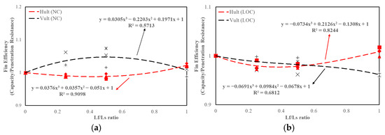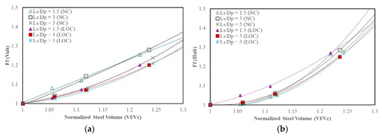 Similarly, the efficiency of fins in terms of capacity relative to steel volume is illustrated in Figure 14a,b. The vertical axis shows the ratio of the fin factor to the normalized steel volume, plotted against ratios. A value greater than unity indicates that the fins contribute more to capacity than the associated increase in steel volume, whereas a value less than unity suggests that the added steel volume outweighs the fins’ contribution to capacity. As shown in the figures, is below unity at lower ratios but exceeds unity as approaches 1.0 for both and , highlighting that longer fins are more efficient in converting additional steel into usable capacity. Interestingly, efficiency gains are observed for under NC at smaller ratios, indicating that vertical resistance can benefit from fins even when the added steel volume is limited. In contrast, shows lower efficiency at small fin lengths, suggesting that horizontal capacity is more dependent on fin development. These results suggest that the increase in steel volume is well balanced by the gain in capacity, particularly at approaching 1.0, demonstrating that longer fins offer improved material efficiency.