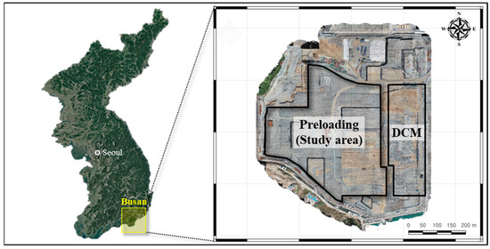Figure 1 illustrates the location of the study site in Busan Newport, South Korea. The site underwent extensive reclamation during the 1980s to establish a large container terminal. This reclamation process used stones, sand, and marine clay to expand the land. Following reclamation and a resting period, ground improvement methods were applied to reduce settlement and strengthen the ground. On the eastern side of the study site, deep cement mixing techniques (DCM) were implemented, while preloading was applied on the western side. This study focuses on the west side of the study site where preloading was applied, and the site is defined as the study area.
