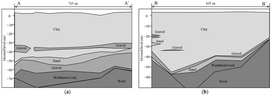 Figure 3 shows the soil profile across cross sections A-A’ and B-B’. In section A-A’, as shown in Figure 3a, a clay layer extends to a depth of around 45 m, with a thin gravel layer within it, followed by layers of sand, gravel, and rock. This clay layer is divided into a reclamation layer and a sedimentary layer; the reclamation layer reaches from the surface down to approximately 10 m, while the sedimentary layer continues from 10 m to 45 m. Figure 3b displays a similar profile in section B-B’, where the clay layer also extends to approximately 45 m, underlain by gravel, sand, and rock layers. In this section, the clay layer is similarly divided, with the reclamation layer ranging from the surface to 7.5 m and the sedimentary layer extending from 7.5 m to 45 m.