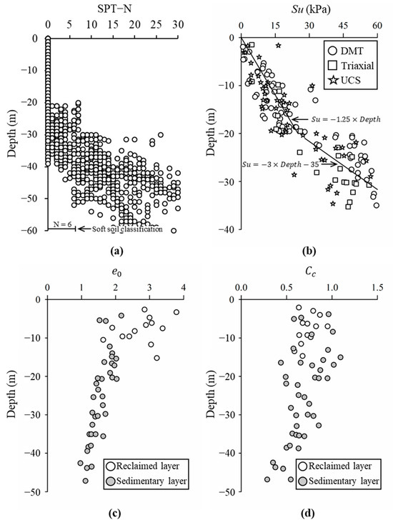 Figure 4 depicts the soil strength and properties according to depth. In Figure 4a, the SPT-N values are presented; they indicate soft layers with SPT-N values below 6 up to a depth of 40 m, followed by a significant increase. Figure 4b shows the undrained shear strength (Su) determined from laboratory and field tests. Su increased linearly with depth and showed a notable transition beyond 20 m.