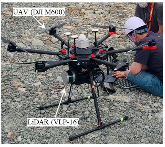 Figure 5 shows the UAV LiDAR used in this study. UAV LiDAR is a remote sensing method that uses laser light to measure distances and create detailed 3D representations of the surface. LiDAR transmits light in the form of lasers to objects and analyzes the returned signal to derive the distance. The result is a point cloud, which is a set of measured points that can be connected to create a surface representation of an object.