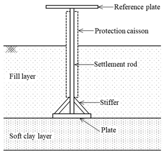 Figure 6 presents the schematic of the settlement plate, which is another measurement device used to monitor the settlement in the study site. The settlement plate consists of several components, including a plate, a stiffer, a settlement rod, a protection caisson, and a reference plate. The elevation changes in the settlement rod reflect the movement of the plate and, consequently, the compression of the soft clay layer. The stiffener and protection caisson help prevent the settlement rod from bending due to construction loads, which ensures accurate measurements of the elevation change in soft clay. The reference plate positioned on top of the settlement rod was used to validate the measurement results based on the UAV LiDAR.