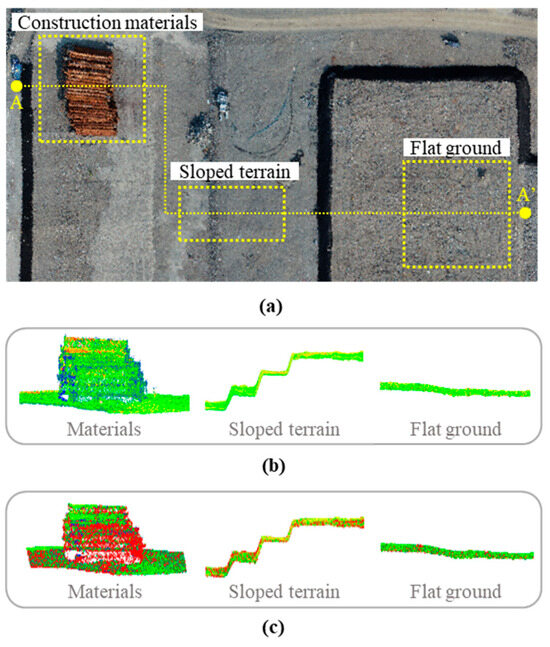 Bare-earth filtering involves separating ground surface points from non-ground points to extract only ground surface data. Construction sites usually contain various obstacles, such as construction materials, vehicles, and workers on the ground surface. If these objects are ineffectively removed, then the quality of the DEM may be degraded. These elements can distort or obscure ground surface data, which reduces the accuracy of analysis. Therefore, bare-earth filtering is a crucial step in generating reliable DEMs.
