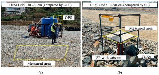 In this study, a flat ground surface and a settlement plate were used to determine the optimal grid size, as shown in Figure 8a,b. The flat ground surface was analyzed by incrementally increasing the grid size from 10 cm to 90 cm at 10 cm intervals. DEMs generated using the mean values at each grid size were compared with reference GPS survey data to evaluate their accuracy.