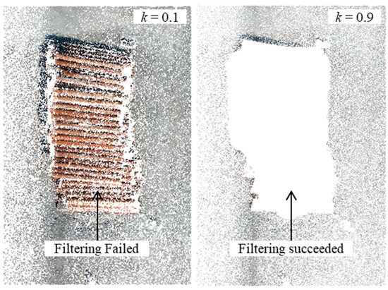 Various denoising techniques have been widely adopted to address the abovementioned challenges. Statistical outlier removal (SOR), moving least squares (MLS), and voxel grid (VG) are widely used methods for removing outliers [37,38,39]. The SOR method calculates the mean distance between a point and its neighbors to identify and remove outliers. The MLS method projects onto smooth and noise-free surface areas to improve data accuracy. The VG method divides the point cloud into 3D voxels and replaces each voxel with its centroid as a representative value [40].