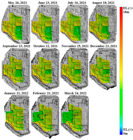 In this study, UAV LiDAR measurements were conducted 19 times at biweekly intervals from May 2021 to March 2022. Measurements were not conducted during snowy or rainy conditions to avoid errors caused by water on the ground.