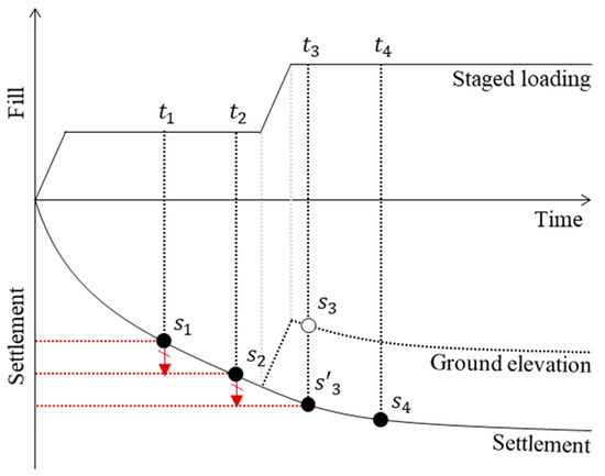 However, during active filling periods, such as t2 to t3, accurate settlement estimation becomes challenging, because the observed change in ground elevation (s3) reflects actual settlement and the added fill thickness. As a result, using raw elevation data alone would lead to an overestimation of the surface level, making it impossible to isolate true settlement.