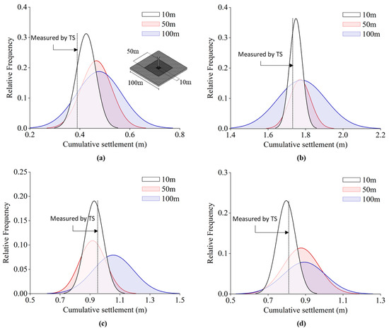 Figure 13 illustrates the comparison of cumulative settlement distribution across various section sizes, represented as normal distribution curves. For all cases, the average settlement values obtained from UAV LiDAR measurements for each section size of 10 m × 10 m align closely with those from the settlement plate measurements (TS). This close alignment indicates consistency in mean settlement across scales. However, the figures show that the deviation in the settlement distribution increases with larger section sizes.