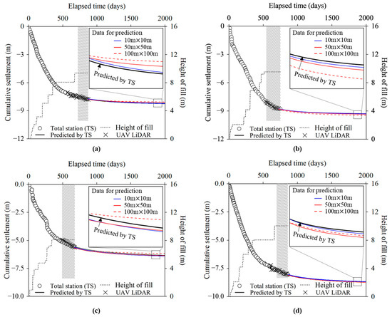 Figure 12 shows the comparison of cumulative settlement range evaluated using UAV LiDAR and the proposed method over a 10-month period at four locations equipped with settlement plates. The cumulative settlement was calculated using the method from Figure 11, which was based on DoDs generated with a 0.5 m grid. The settlement distribution range, which was derived from UAV LiDAR measurements, is represented for the following three different sections centered on the settlement plate: 10 m × 10 m, 50 m × 50 m, and 100 m × 100 m.