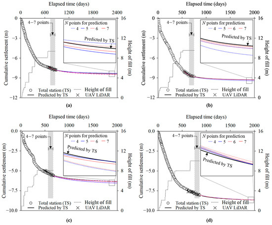 In addition to the spatial section analysis, the influence of UAV LiDAR measurement frequency on final settlement prediction accuracy was examined following the completion of surcharge fill construction. UAV LiDAR surveys were conducted at 2-week intervals, and predictions were generated based on four, five, six, and seven measurements using the 10 m × 10 m section. These predictions were then compared with the settlement plate results.
