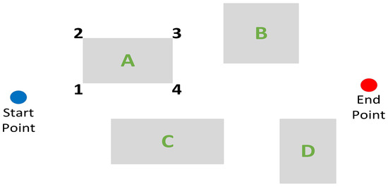 where is the sum of the distance from start-point to entry-point of the jth area and length of paths planned using lawnmover mode in the jth area. is the distance from exit-point of the last area to end-point. In the example shown in Figure 3, is the total path length of the first area marked by the blue line and is the total path length of the second area represented by the green line. And is the distance from exit-point of the second area to end-point marked by the red line.