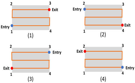 Four kinds of planned lawnmower paths from different entry-points for a task area. The numbers from 1 to 4 represent four corners of an area. (1) The planned path from entry-point in lower-left corner, (2) the planned path from entry-point in upper-left corner, (3) the planned path from entry-point in upper-right corner, (4) the planned path from entry-point in lower-right corner.
