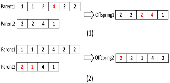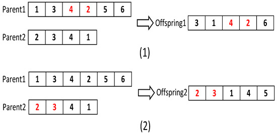 In this paper, crossover operation is performed between two individual chromosomes which involve task sequence and entry-point sequence. And order crossover (OX) is selected for this operation, since the ordered gene sequence is preserved and gene values are not duplicated in OX operation, which is suitable for optimization problems similar to TSP [41]. Specially, , which is a variation of traditional order crossover, is utilized for crossover operation [42]. Considering the variable length of the individual chromosome, is modified. One of the modifications is that the size of the chromosome segment from parents is half the length of the shorter individual chromosome during crossover operation. And another modification is that sequence length of the offspring is half the sum of the sequence length of parents according to Equation (8). An example is shown in Figure 4.
