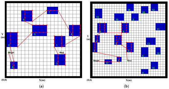 Figure 8 shows the planning trajectory after optimization in the simulation. In the diagram, the task areas are represented by blue rectangles and the planning trajectory is marked with a red line. And each task area is identified by a green identity number. The side length of one grid in the figure is 50 m and the distance between survey lines is 100 m. The point marked with “Begin” is the start-point of the AUV and the point marked with “End” is the end-point. In the 8-area scenario, the optimized task sequence is 8-2-5-6-7-4-1-3. The entry-point for each area is 1-1-1-1-1-1-4-2. In the 20-area scenario, the optimized task sequence is 17-1-7-4-14-8-5-3 and the entry-point for each area is 1-4-4-1-1-4-1-4.