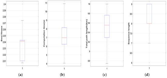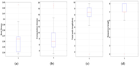 The box plot of statistic data for the scenario with 20 areas after 100 executions of the GA simulation is shown in Figure 9 and the key metrics of box plots are listed in Table 4. From the statistics, it can be seen that although computation time and total distance have a significant volatility, the value of best fitness and the number of covered areas have a certain stability.